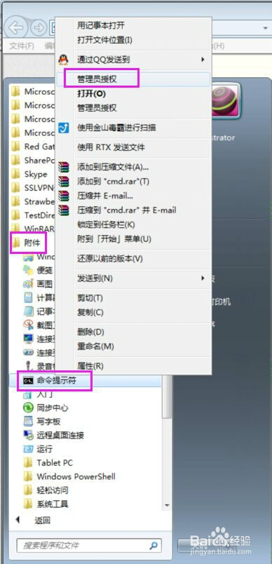 2. 依次点击“开始”—“所有程序”—“附件”,右键点击“命令行提示符”,选择“以管理员身份运行”,64位操作系统是”以管理员身份运行“。我的操作系统为win7 32位操作系统,选择”管理员授权“。