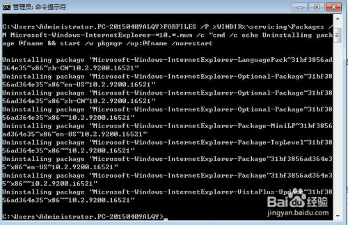 7. 最后命令运行停止以后重启电脑,系统会还原我们在安装IE11之前的IE版本。下面的图是命令运行停止的界面,看到此界面重启电脑,根据下面的步骤继续。